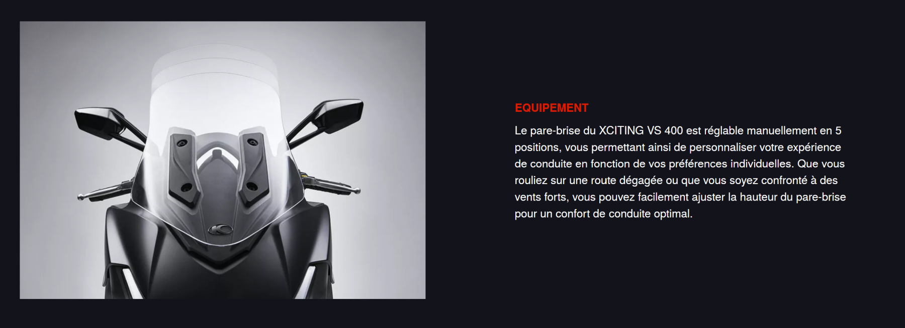 Prêt à vivre une expérience de conduite exceptionnelle ? Le XCITING VS 400 est là pour répondre à toutes vos attentes. Avec son design unique de Sport Touring, ce modèle combine à la fois puissance et élégance. Le XCITING VS 400 offre une approche centrée sur le pilote pour une conduite sans stress et un confort optimal. Que ce soit pour vos déplacements professionnels ou vos loisirs, le XCITING VS 400 offre un équilibre parfait pour répondre à vos besoins.